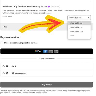 Our fundraising payment platform is through Zeffy. Zeffy lets you choose to pay their fees (to cover transaction fees and their business costs that lets them offer free nonprofit tools and support) or not. This fee is suggested on every transaction.